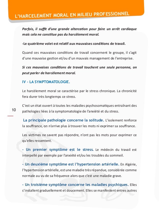 Sonia 22 mars 2011 à 1825. En effet si le harcèlement moral altère considérablement létat de santé physique ou mentale du salarié il peut se retrouver dans limpossibilité dexercer son activité professionnelle pendant plusieurs jours. Prohibé par le Code du travail le harcèlement moral au travail se caractérise par des agissements répétés qui ont pour objet ou pour effet une dégradation de ses conditions de travail susceptible de porter atteinte à ses droits et à sa dignité daltérer sa santé physique ou mentale ou de compromettre son avenir professionnel.